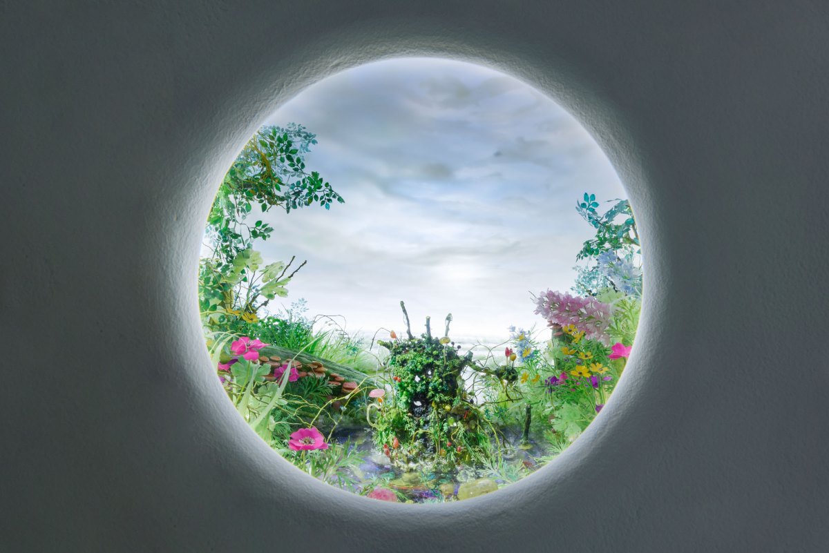 At Andrea Nuovo Gallery, the artist presents newly created work with a sense of both stillness and drama.  Here, Jacobs creates a kind of reverie, soothing but unsettling around the edges.  Comprising prints, wallpaper, and sculpture in a wide array of media, they appear in three distinct settings.  Firstly, the artist creates a “ghost portrait gallery” of psychopomps with backdrop wallpaper and haunted forest ephemera in the form of painted bronze sculptures on pedestals. In the second section, Jacobs moves from the portrait to the landscape, creating his miniature worlds, in this case ensconced with specters in four of his signature diorama creations, especially made for the Gallery’s distinctive triangular space.   In the final section, Jacob’s creations are seen outdoors, as the artist’s imagined miniature landscapes are transformed to a real one, and psychopomp busts appear in the verdant setting of the Gallery’s Neapolitan Garden.