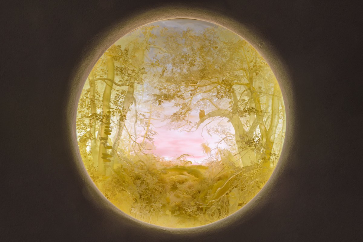 In Jacobs’ previous ambitious and detailed dioramas, the artist has resisted incorporating living animals that might have suggested movement, as they might “freeze” his work into fixed position.  But the owl, with its perpetual stillness while at rest, punctuated by occasional lightning-fast flight and hunting strikes, is the perfect animal to reside in his creation: the owl makes sense and satisfaction of stillness. The owl is both more and less than an owl ⎯it is a figment of imagination, a reflective dream. The composition is a study in topographical contrasts and symbolic layers: while in the foreground, the forest seems to curl in upon itself with fallen logs and half bare trees that portent a sinister night of forest sprites, in the middle-distance palm trees beckon, suggesting a tropical paradise, while in the far distance Vesuvius acts as a distant echo of doom.