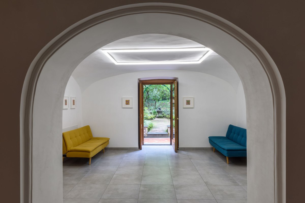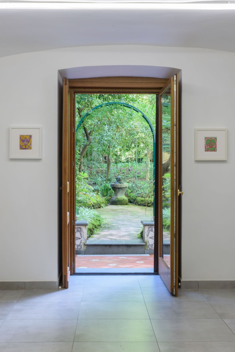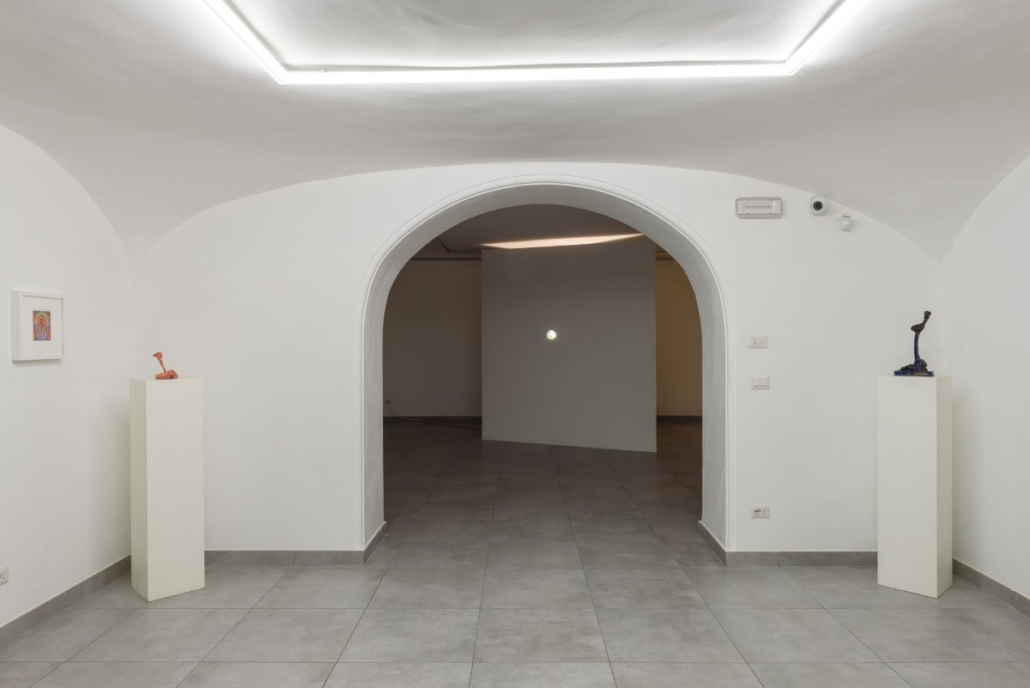 Jacobs’ first presentation in Italy since 2019, and his debut exhibition in Naples of all new work, the Psychopomp of the title refers to the spirits who guide the souls of the newly deceased as they cross the threshold from one realm to another. In the artist’s work, they do not judge the dead, but merely guide them.  This psychological desire for the security of guidance in the aftermath death represents what Jacobs is exploring as an elemental human need. Variations of the psychopomp as spiritual guide exist in a huge array of religions, both ancient (such as the Greek ferryman Charon to the underworld) and still practiced (the Catholic vision of St. Michael in the role of “angel of death”, taking souls to heaven). Jacobs draws upon these strands of religious traditions, but creates distinct of the elements of the pagan, showing his psychopomps as interwoven elements of nature: human, animal, and plant.  Jacob’s view of the afterlife is less one of hell, and more one of “wonderland”⎯a place to find answers to our questions, to finally understand the desires that unconsciously drive us.