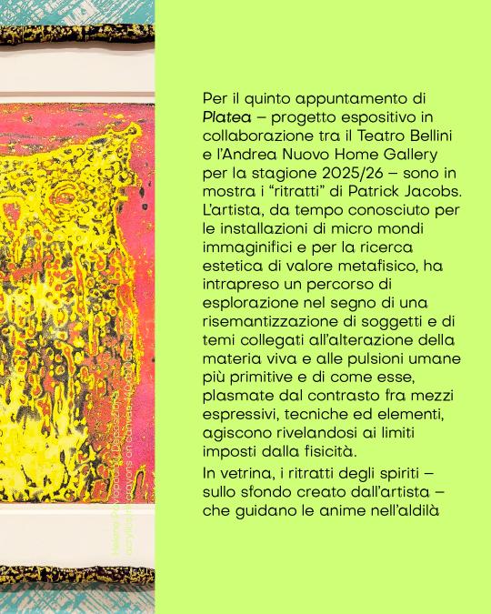 Nel quinto appuntamento di Platea – progetto espositivo in collaborazione tra il Teatro Bellini e l’Andrea Nuovo Gallery per la stagione 2025/2026 – sono in mostra i “ritratti” di Patrick Jacobs.